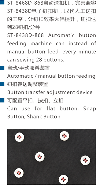 ST-8468D-868自動送扣機(jī),完善兼容ST-8438D電子釘扣機(jī),取代人工送扣的工序,讓釘扣效率大幅提升,鈕扣達(dá)到28鈕扣/分鐘